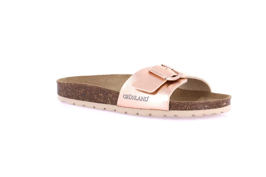 Das Obermaterial dieser Sandale besteht aus recycelten und nachhaltigen Materialien. Beliebt perlmuttfarbene Farbe, wird es Ihre Füße in den wärmeren Monaten dank der Einlegesohle aus Naturkork verwöhnen.